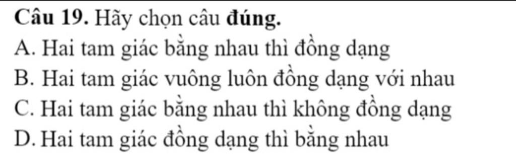 `D.` Hai tam giác đồng dạng thì bằng nhau