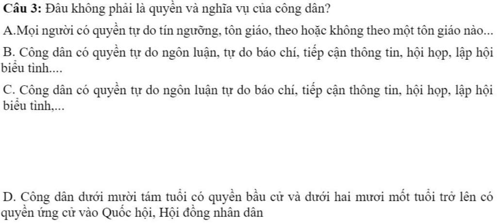 `⇒` Câu D không phải là quyền và nghĩa vụ của công dân vì công dân từ 18 tuổi trở lên mới có quyền bầu cử và đủ 21 tuổi trở lên đều có quyền ứng cử đại biểu Quốc hội, Hội đồng nhân dân.
