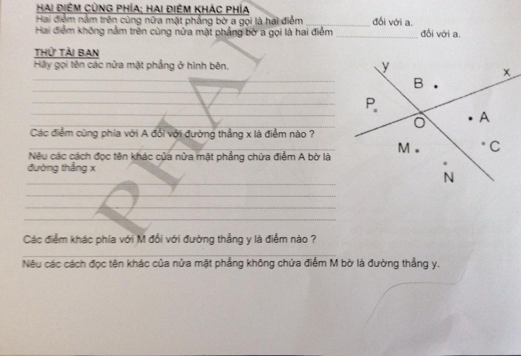 - Các cách đọc khác của nửa mặt phẳng chứa điểm A bờ là đường thẳng x là: Nửa mặt phẳng bờ Ox chứa M; Nửa mặt phẳng bờ Ox chứa N; Nửa mặt phẳng bờ Ox chứa C; Nửa mặt phẳng bờ Ox chứa A.