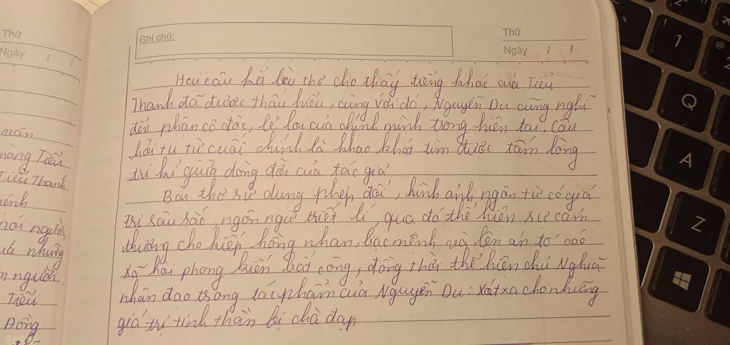 => Nghĩa cả câu là viếng nàng qua một tập sách nhỏ. Tập sách không phải là một cuốn sách thông thường, đó là sự hiện diện của một cuộc đời nhan sắc tài hoa, là chân dung tinh thần của một cuộc đời bạc mệnh. Cuốn sách đó còn là tài, là tình của nàng Tiểu Thanh. Hiểu nàng thương nàng thì đọc cuốn sách phải rưng rưng rơi lệ.