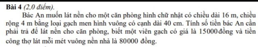 Số tiền viên gạch men bác An cần phải mua để lát nền là :