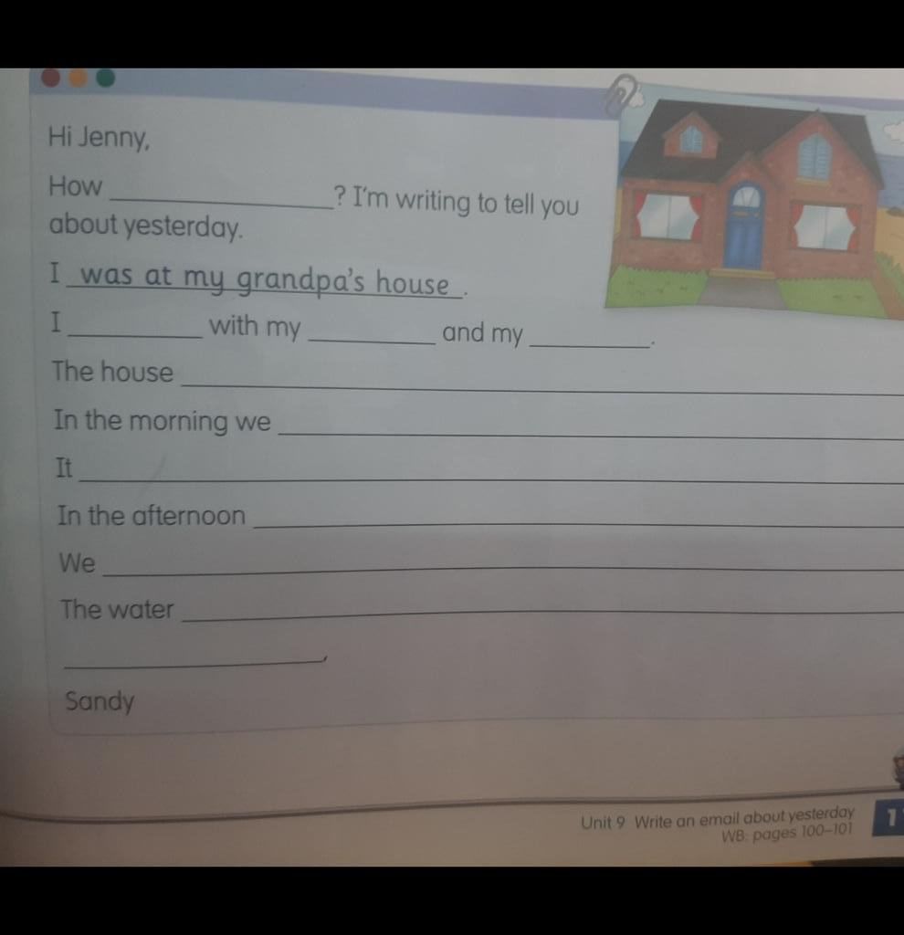 Hi Jenny, How ? I'm writing to tell you about yesterday. I was at my grandpa's house with my and my The house In the morning we It In the afternoon We The water Sandy Unit 9 Write an email about yesterday WB: pages 100-101