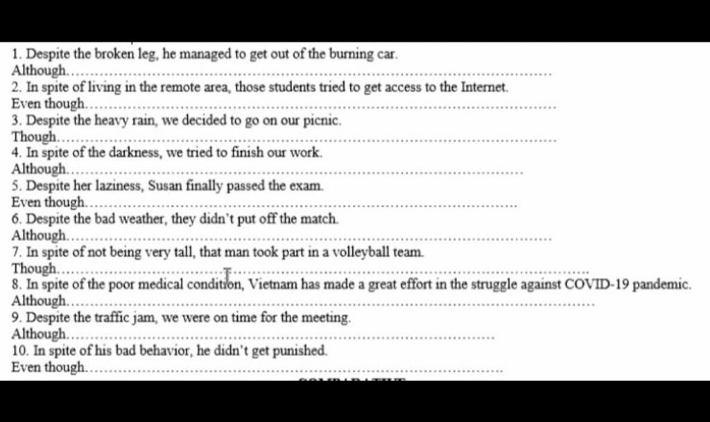 ` ~ ` CT In spite of `/` Despite : In spite of `/` Despite `+` N `/` N phrase (Cụm Danh từ) `/` V`-`ing