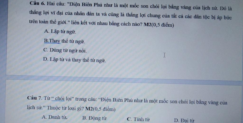 Hai câu “Điện Biên Phủ như là một mốc son chói lọi bằng vàng của lịch sử. Đó là thắng lợi vĩ đại của nhân dân ta và cũng là thắng lợi chung của tất cả các dân tộc bị áp bức trên toàn thế giới” liên kết với nhau bằng cách lặp từ và thay thế từ ngữ (cụ thể là cụm từ “thắng lợi vĩ đại”, “thắng lợi chung”.