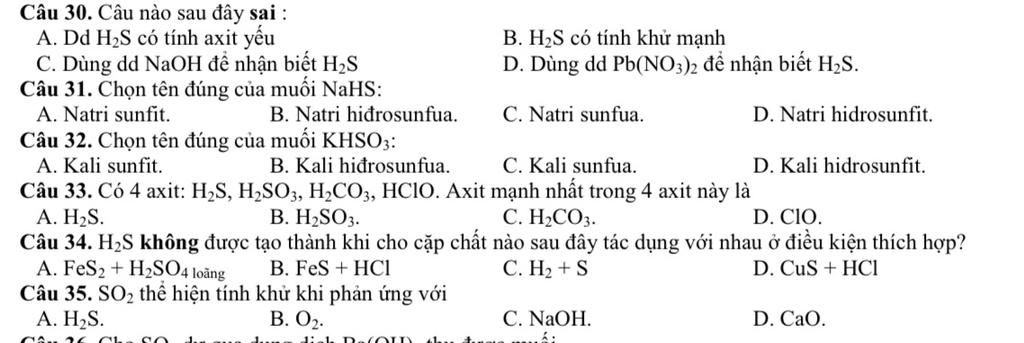 Câu 31. Chọn tên đúng của muối NaHS: