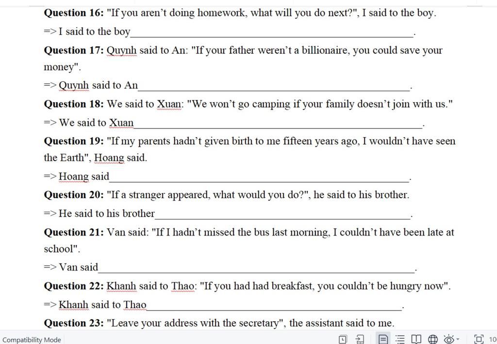 Question 17: Quynh said to An: "If your father weren't a billionaire, you could save your