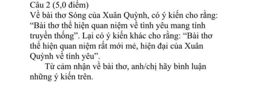 Về bài thơ Sóng của Xuân Quỳnh, có ý kiến cho rằng: “Bài thơ thể hiện quan niệm về tình yêu mang tính truyền thống”. Lại có ý kiến khác cho rằng: “Bài thơ thể hiện quan niệm rất mới mẻ, hiện đại của Xuân Quỳnh về tình yêu”.