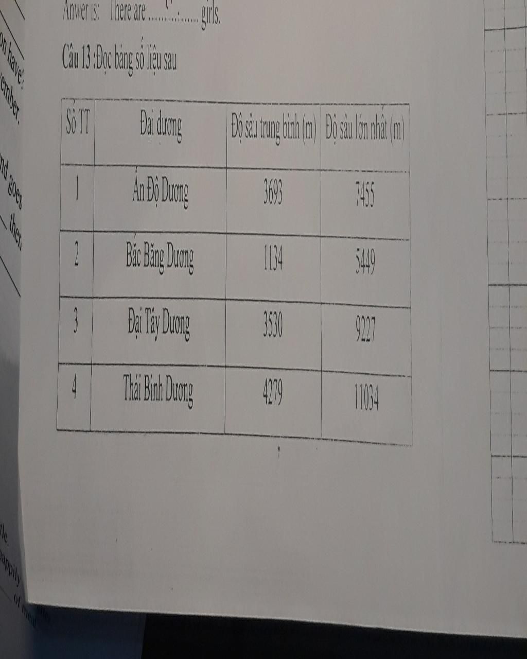 Dựa vào bảng số liệu trên hãy sắp xếp độ sâu trung bình của các đại dương theo thứ tự tăng dần.