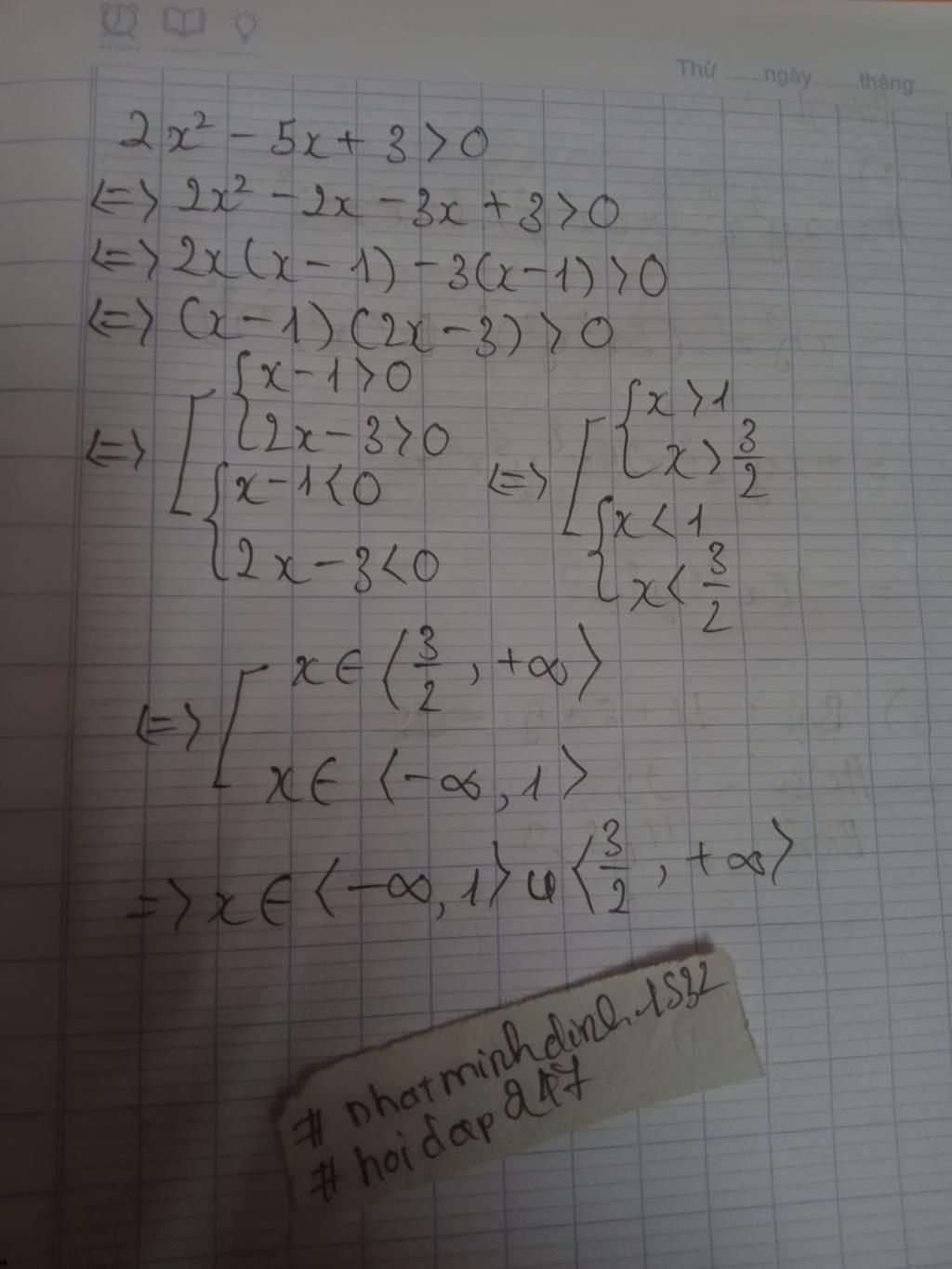 * Sửa chỗ trường hợp `1` `-` Trường hợp `1` : `{(x-1>0),(2x-3>0):}` `⇔{(x>1),(x>3/2):}` `=>` `x>3/2`