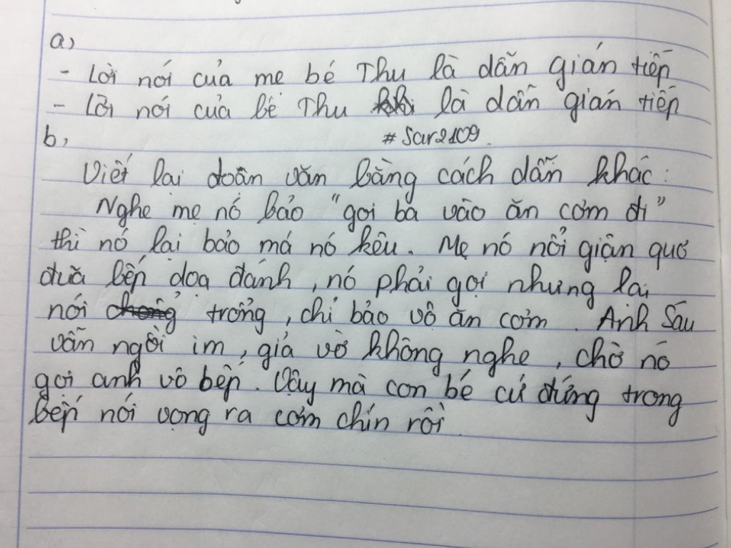 b, Nghe mẹ bảo nó gọi ba vào ăn cơm thì nó khoogn chịu rồi kêu mẹ tự gọi đi. dù mẹ nó có nổi giận quơ đũa bếp dọa đánh, nó phải gọi nhưng lại gọi một cách rất chống không, nó kêu ông Sáu tự vô ăn cơm thôi. Anh Sáu vẫn ngồi im, giả vờ không nghe, chờ nó gọi Ba. Nhưng con bé vẫn không chịu gọi Ba mà gọi ông Sau bằng cách bào hiệu là cơm đã chín rồi.