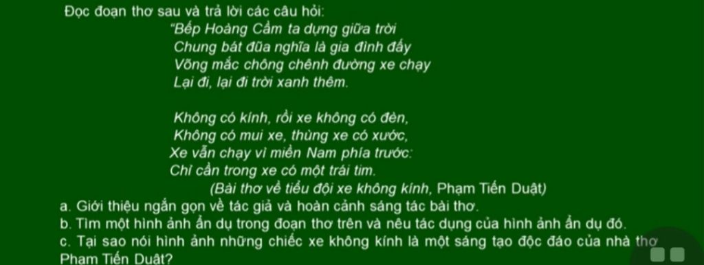 b, Hình ảnh hoán dụ trong đoạn thơ trên là hình ảnh "Chỉ cần trong xe có một trái tim". Hình ảnh trái tim là một hình ảnh tuyệt đẹp nhằm kết thúc bài thơ. Trái tim ở đây được hiểu là hình ảnh hoán dụ cho những tình yêu của những người lính đối với quê hương, đất nước và những ý chí, quyết tâm, sức mạnh của họ trên con đường giành lại độc lập tự do cho đồng bào và dân tộc. Câu kết thúc như một lời khẳng định "Chỉ cần trong xe có 1 trái tim", tức là chỉ cần họ còn sống, tình yêu đối với tổ quốc vẫn còn thì những người lính vẫn tiếp tục lái những chiếc xe không kính để giải cứu miền Nam trên những tuyến đường Trường Sơn huyền thoại.