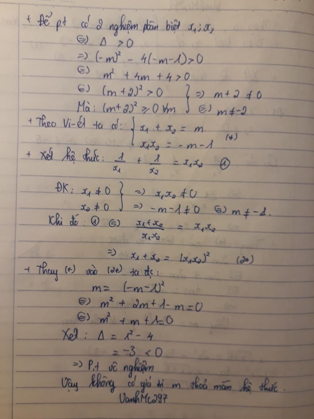 vậy m =3+√5/2 hoặc m= 3-√5/2 thì t/m 1/x1+1/x2=x1x2