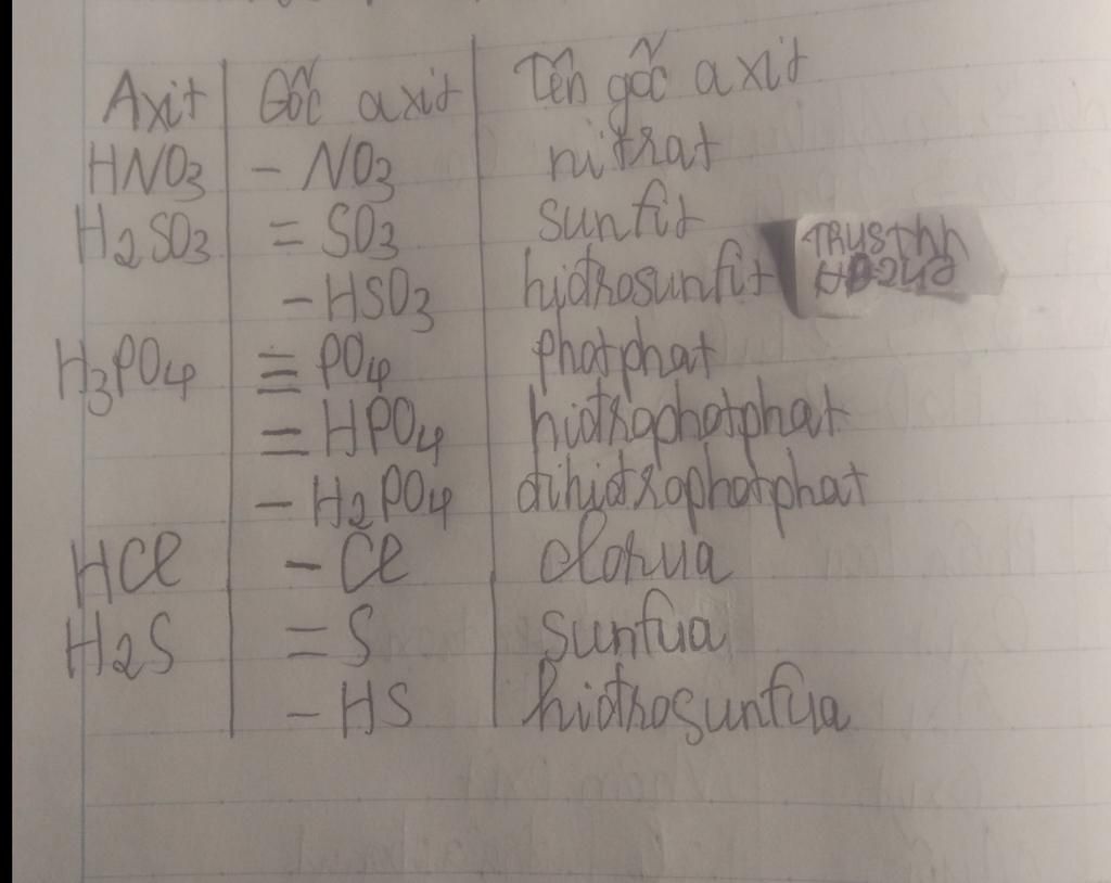\begin{array}{|c|c|c|}\hline \text{axit}&\text{gốc axit}&\text{tên gốc axit}\\\hline \text{HNO$_{3}$}&\text{-NO$_{3}$}&\text{nitrat}\\\hline \text{H$_{2}$SO$_{3}$}&\text{=SO$_{3}$}&\text{sunfit}\\\hline \text{H$_{3}$PO$_{4}$}&\text{≡PO$_{4}$}&\text{photphat}\\\hline \text{HCl}&\text{-Cl}&\text{clorua}\\\hline \text{H$_{2}$}&\text{=S}&\text{sunfua}\\\hline\end{array}
