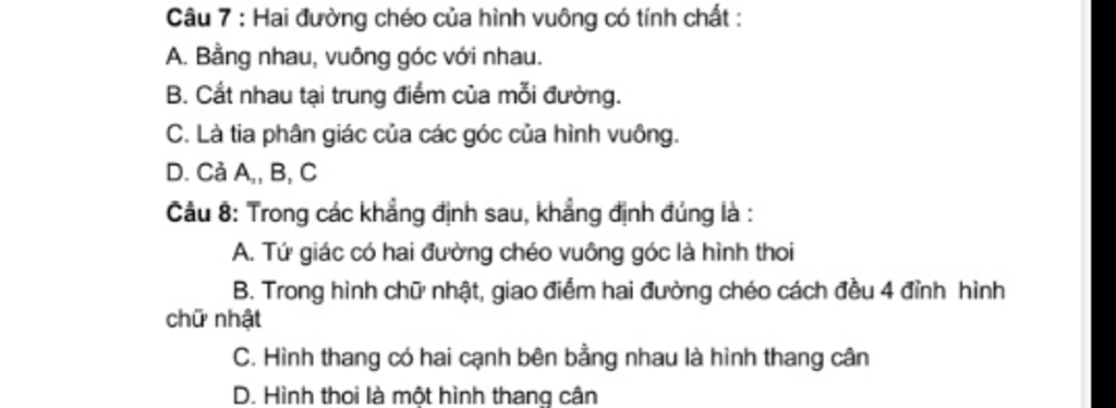 Câu 7: Hai đường chéo của hình vuông có tính chất :