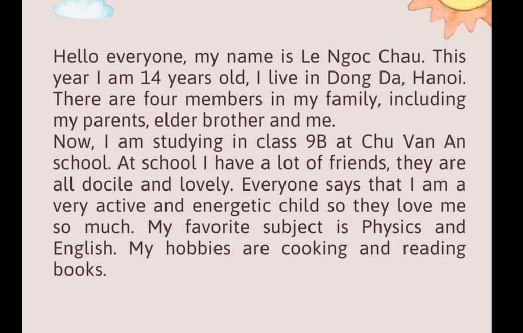 Xin chào mọi người, tôi tên là Lê Ngọc Châu. Năm nay tôi 14 tuổi. Tôi sống ở Đống Da,Hà Nội. Trong gia đình tôi có 4 thành viên là, bố mẹ, anh trai và tôi.