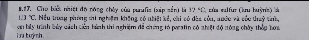 `==>` Parafin có nhiệt đổ nóng chảy < 100 độ C, lưu huỳnh thì > 100 độ C nên suy ra parafin có nhiệt độ nóng chảy thấp hơn lưu huỳnh