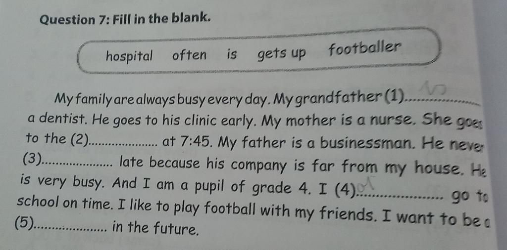 My family are always busy every day. My grandfather ...is... a dentist. He goes to his clinic early. My mother is a nurse. She goes to the ...hospital... at 7:45. My father is a businessman. He never ...gets up... late because his company is far from my house. He is very busy. And I am a pupil of grade 4. I ...often... go to school on time. I like to play football with my friends. I want to be a ...footballer... in the future.