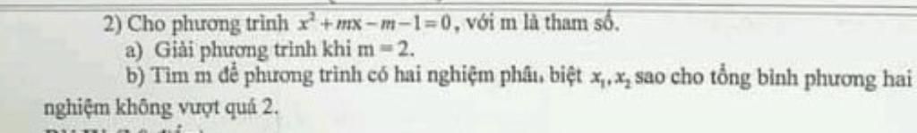 Vậy `-2<m<=0` thì phương trình có hai nghiệm phân biệt `x_1; x_2` có tổng bình phương hai nghiệm không vượt quá `2.`