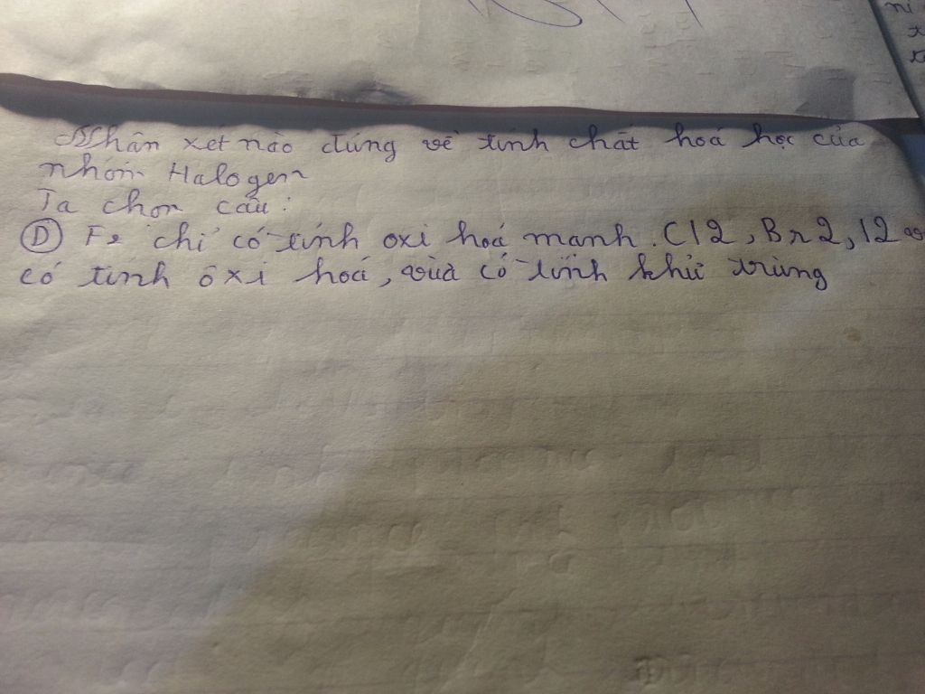 (F2 chỉ có thể giảm số oxi hoá 0 xuống -1 nên chỉ có tính oxi hoá. Các halogen khác có các số oxi hoá dương nên ngoài tính oxi hoá còn có tính khử)