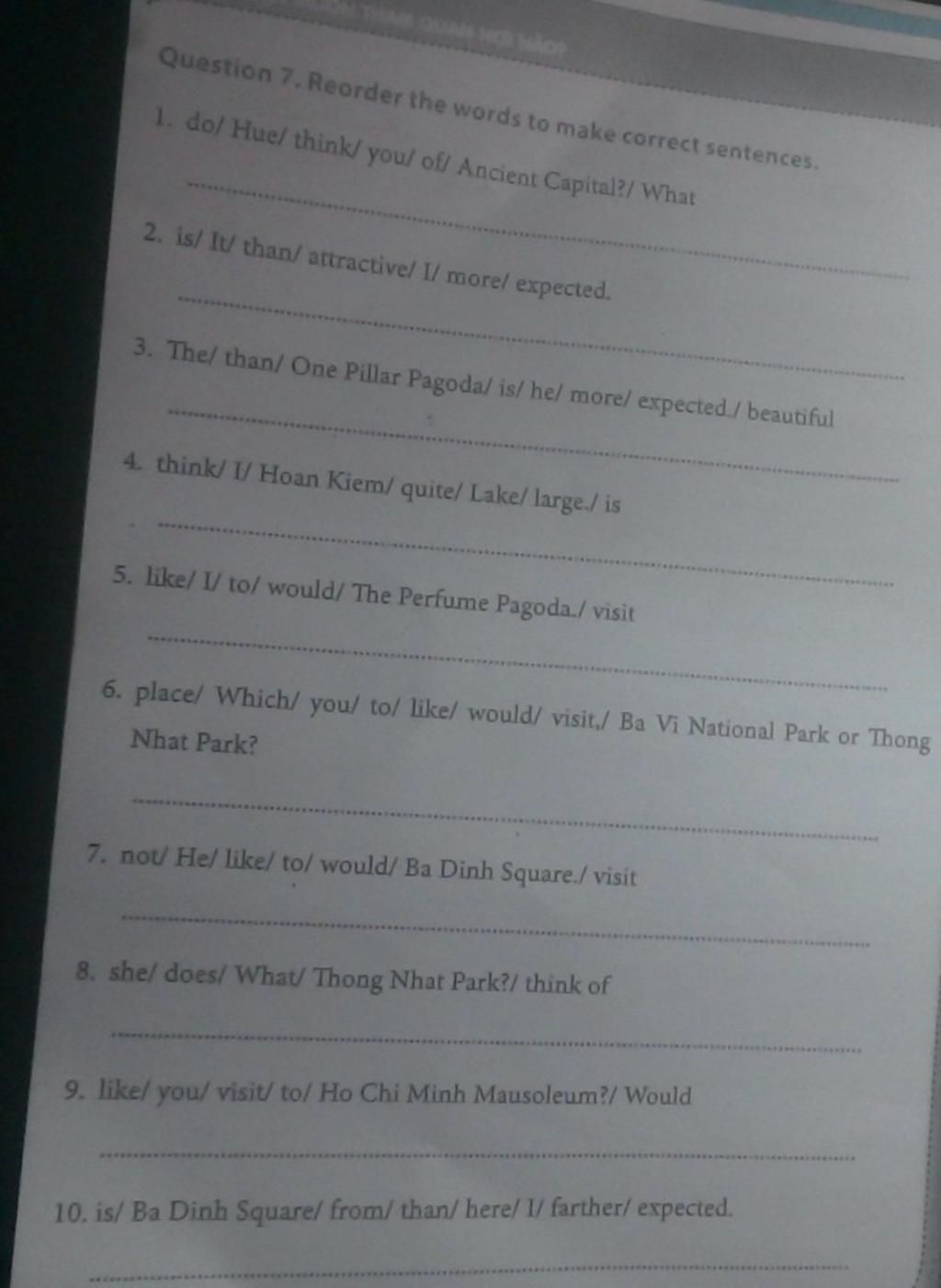 1-What do you think of Hue Ancient Capital? 2-It is more attractive than I expected 3-The One Pillar Pagoda is more beautiful than he expected 4-I think Hoan Kiem Lake is quite large 5-I would like to visit The Perfume Pagoda 6-Which place would you like to visit , Ba Vi National Park or Thong Nhat Park? 7-He would not like to visit Ba Dinh Square 8-What does she think of Thong Nhat Park? 9-Would you likt to visit Ho Chi Minh Mausoleum? 10-Ba Dinh Square is farther from here than I expected. Rút gọn1-What do you think of Hue Ancient Capital? 2-It is more attractive than I expected 3-The One Pillar Pagoda is more beautiful than he expected 4-I think Hoan Kiem Lake is quite large 5-I would like to visit The Perfume Pagoda 6-Which place would y... xem thêm