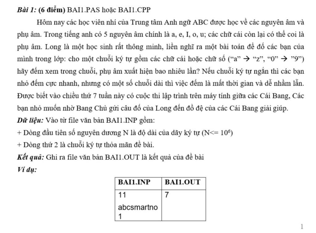 - Nhập n - Nhập s - d=0 - for i -> s, nếu i không phải các nguyên âm hay số thì tăng biến đếm lên 1 - xuất biến đếm