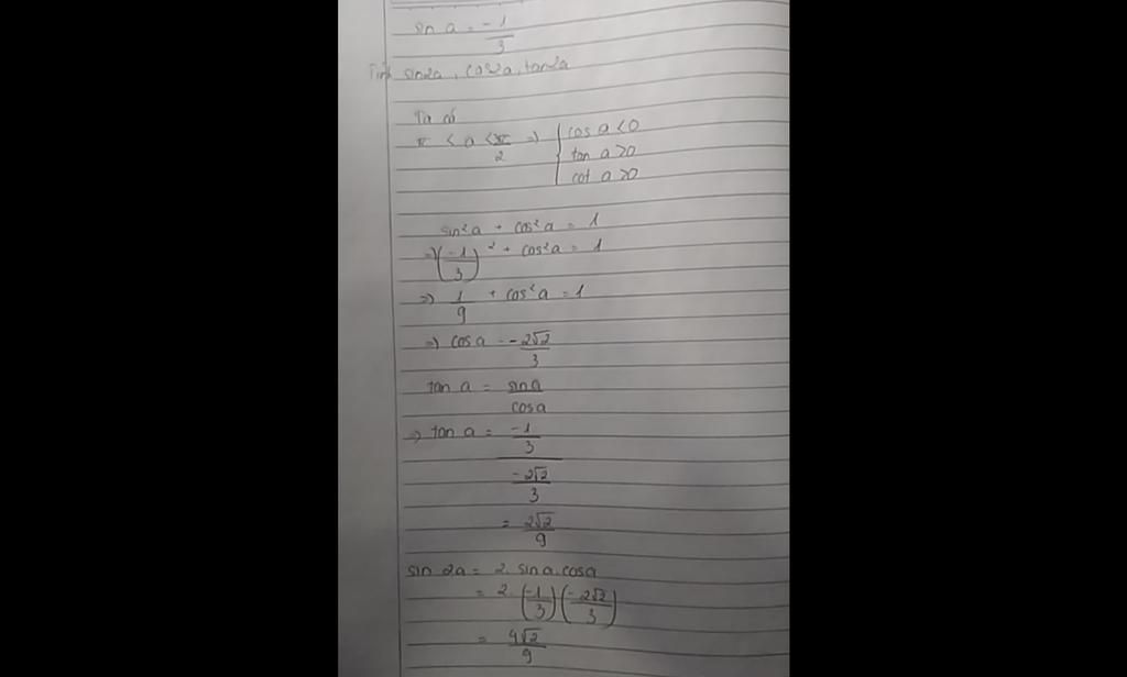 `tana=(sina)/(cosa)=(-1/3)/((-2\sqrt{2})/3)=(\sqrt{2})/(4)`