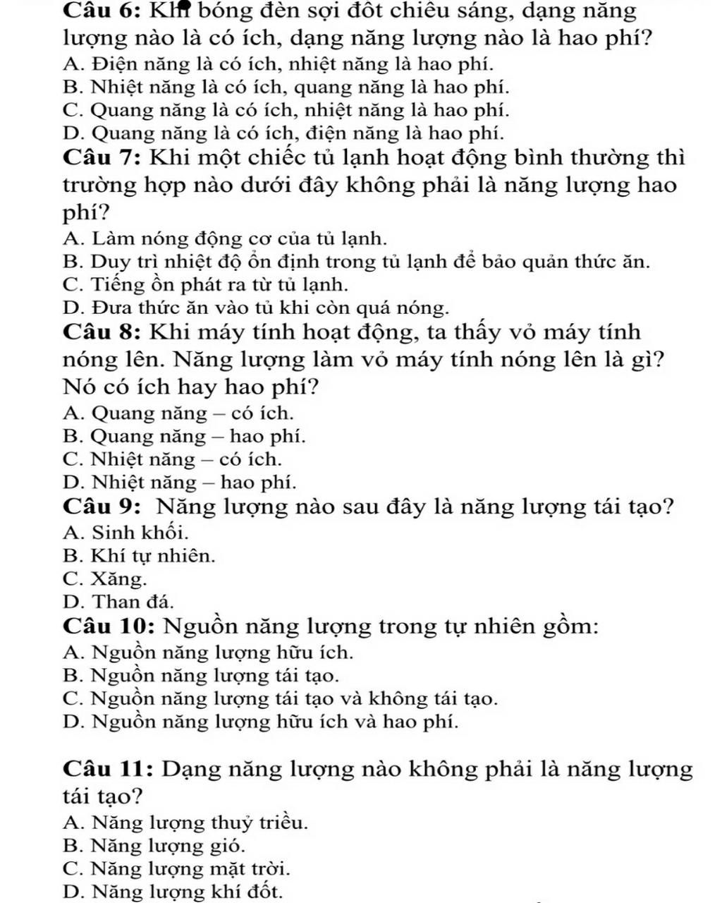 Câu 10: Nguồn năng lượng trong tự nhiên gồm: