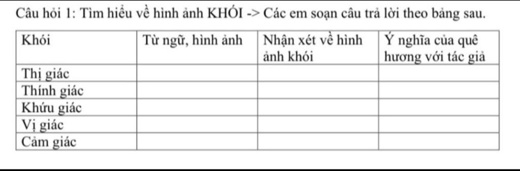 Câu hỏi 1: Tìm hiểu về hình ảnh KHÓI -> Các em soạn câu trả lời theo bảng sau.
