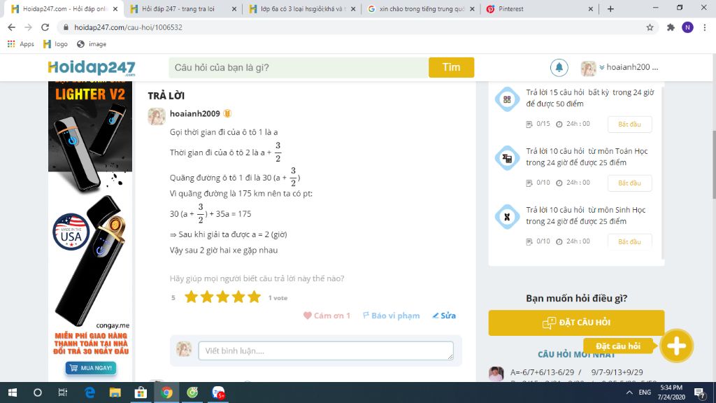 Hai ô tô cùng khởi hành từ hai bến cách nhau 175km để gặp nhau. Xe thứ nhất có vận tốc 30km/h.