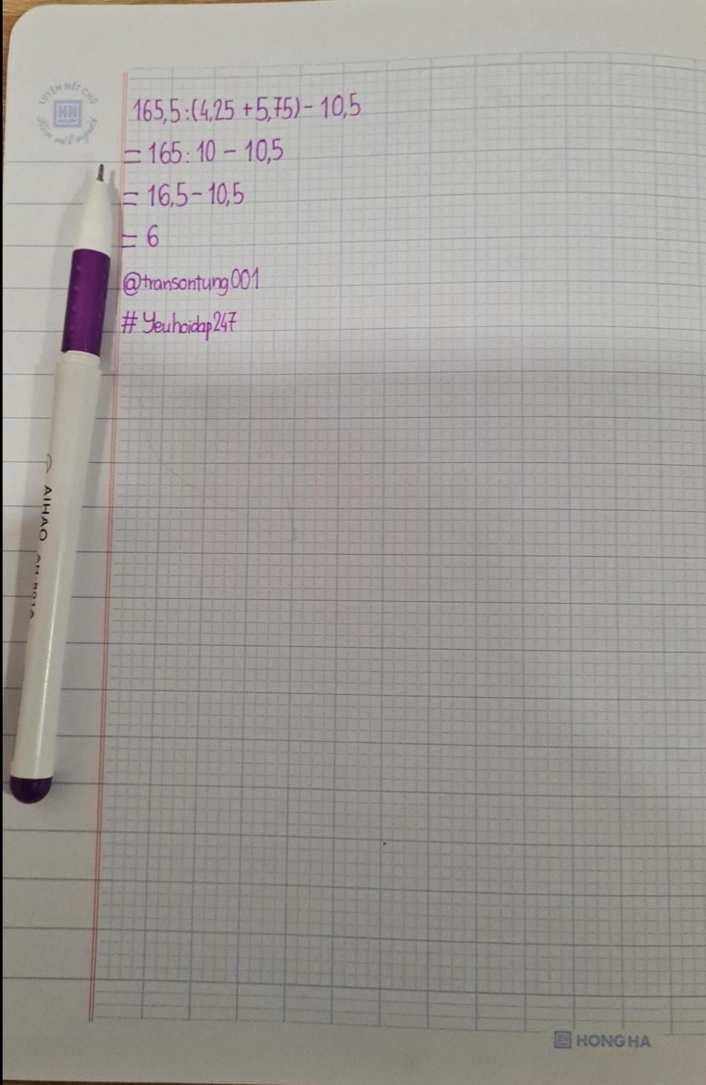 165,5 : ( 4,25 + 5,75 ) - 10,5 = 165,5 : 10 = 16,55 - 10,5 = 6,05