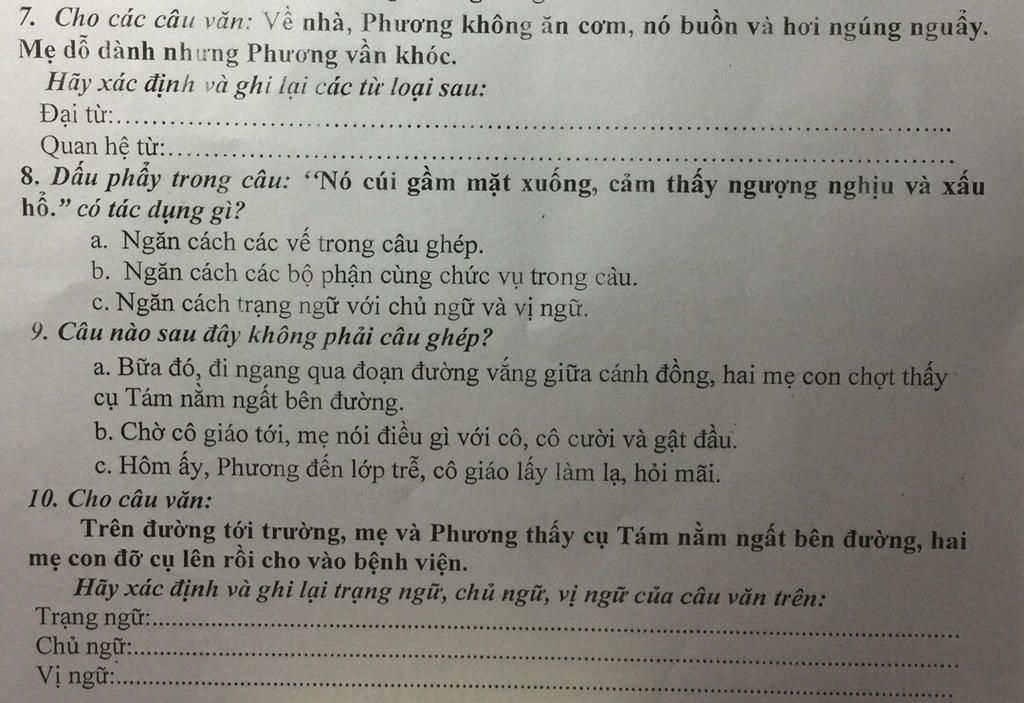 7.Cho các câu văn : Về nhà, Phương không ăn cơm, nó buồn và hơi ngúng nguẩy. Mẹ dỗ dành nhưng Phương vẫn khóc.