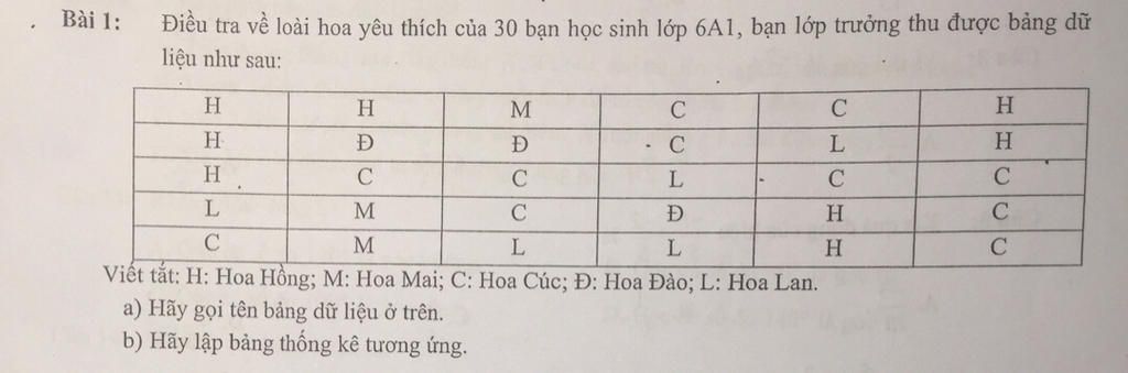 Điều tra về loài hoa yêu thích của 30 bạn học sinh lớp 6A1, bạn lớp trưởng thu được bảng dữ