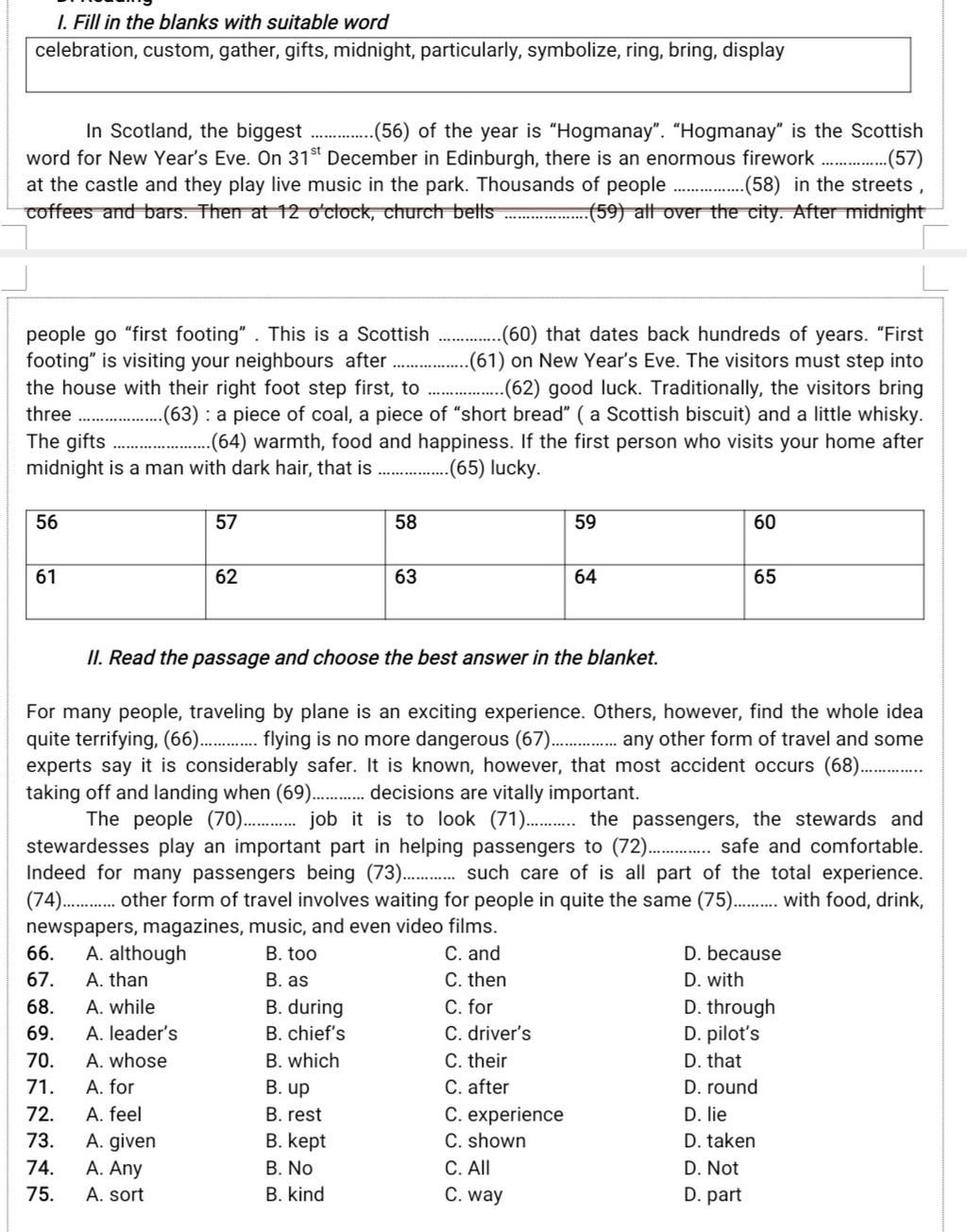 Tạm dịch: Ở Scotland, lễ kỷ niệm lớn nhất trong năm là "Hogmanay". "Hogmanay" là từ tiếng Scotland để chỉ đêm giao thừa. vào ngày 31 tháng 12 ở edinburgh, có một màn bắn pháo hoa khổng lồ tại lâu đài và họ chơi nhạc sống trong công viên. Hàng nghìn người tụ tập trên đường phố, cà phê và quán bar. Sau đó, tại 12o'colock, chuông nhà thờ vang lên khắp thành phố. Quá nửa đêm người ta đi "tiên đồng". Đây là một phong tục của người Scotland đã có từ hàng trăm năm trước. "Tiên sinh" là đến thăm hàng xóm sau nửa đêm của đêm giao thừa. Khách phải bước chân phải vào nhà trước để mang lại may mắn. Theo truyền thống, du khách mang đến ba món quà: một miếng than và một ít rượu whisky. Những món quà tượng trưng cho sự ấm áp, ẩm thực và hạnh phúc. Nếu người đầu tiên đến thăm nhà bạn sau nửa đêm là một người đàn ông có mái tóc đen thì đó là điều đặc biệt may mắn.