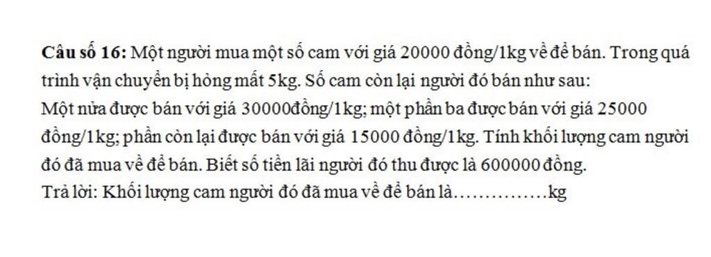 Câu số 16: Một người mua một số cam với giá 20000 đồng/1kg về để bán. Trong quá