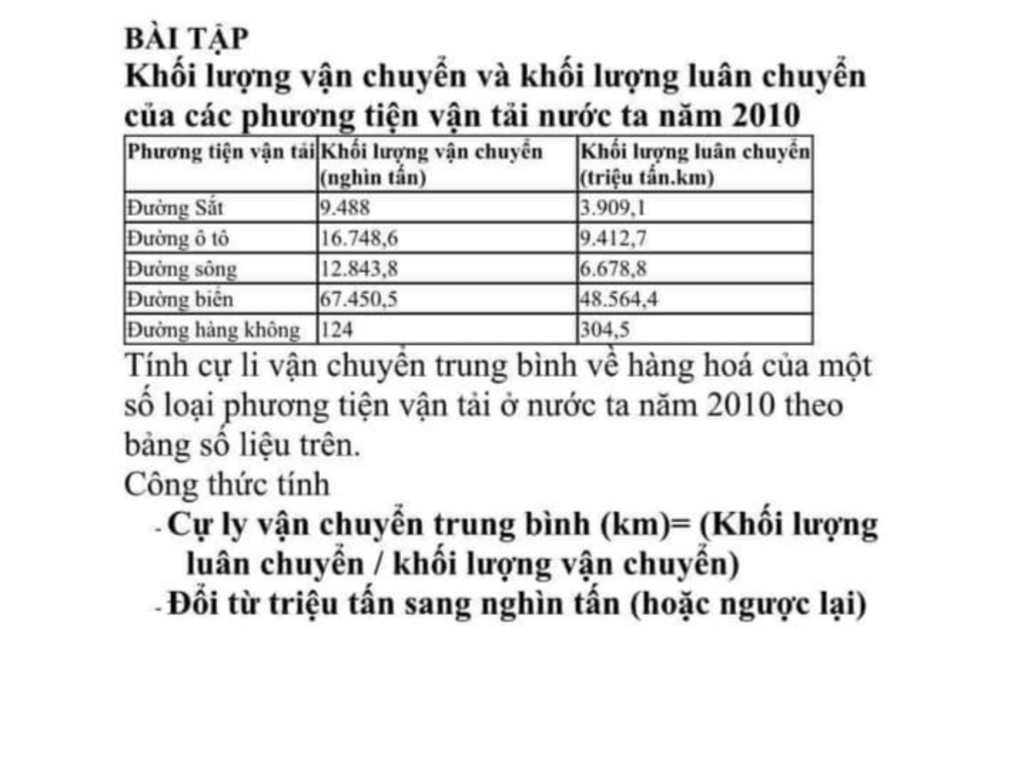 Cự li vận chuyển trung bình = $\dfrac{Khối lượng luân chuyển}{Khối lượng vận chuyển}$