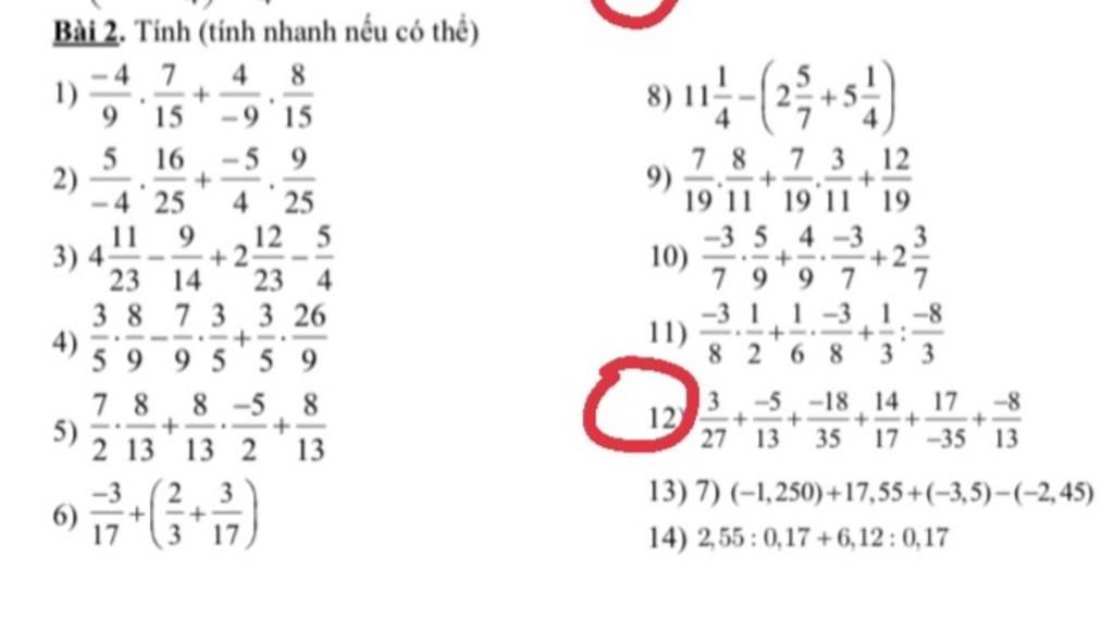$12,\dfrac{3}{17}+\dfrac{-5}{13}+\dfrac{-18}{35}+\dfrac{14}{17}+\dfrac{17}{-35}+\dfrac{-8}{13}\\ =\dfrac{3}{17}-\dfrac{5}{13}-\dfrac{18}{35}+\dfrac{14}{17}-\dfrac{17}{35}-\dfrac{8}{13}\\ =\left(\dfrac{3}{17}+\dfrac{14}{17}\right)-\left(\dfrac{5}{13}+\dfrac{8}{13}\right)-\left(\dfrac{18}{35}+\dfrac{17}{35}\right)\\ =\dfrac{17}{17}-\dfrac{13}{13}-\dfrac{35}{35}\\ =1-1-1\\ =-1$$#hungg$