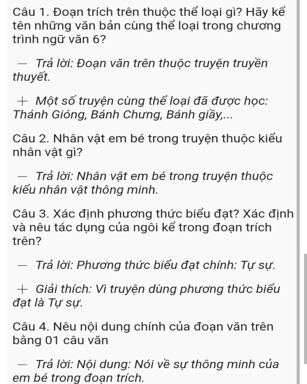 Câu 1. Đoạn trích trên thuộc thể loại gì? Hãy kể tên những văn bản cùng thể loại trong chương trình ngữ văn 6?