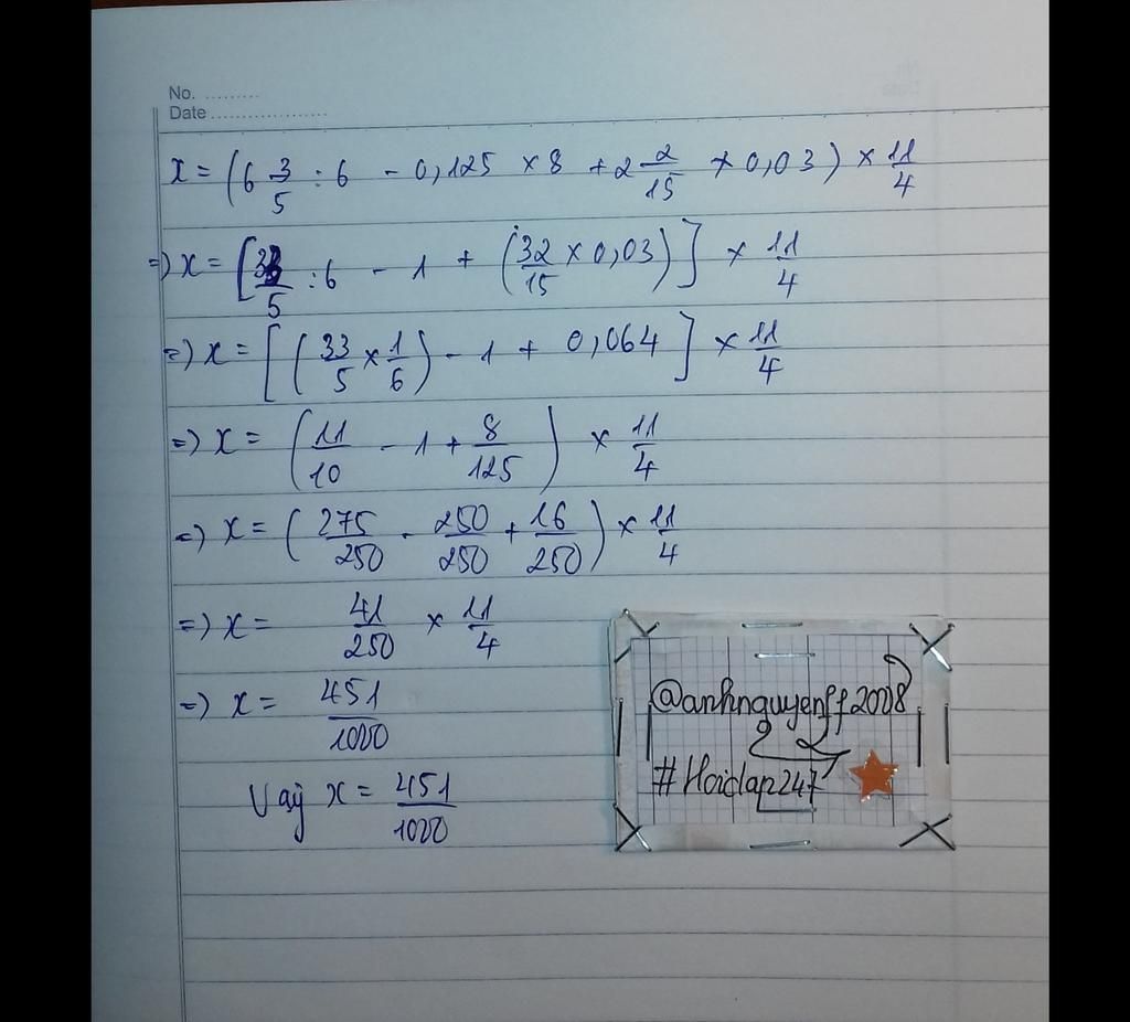 `x = ( 6 3/5 : 6 - 0,125 xx 8 + 2 2/15 xx 0,03 ) xx 11/4`
