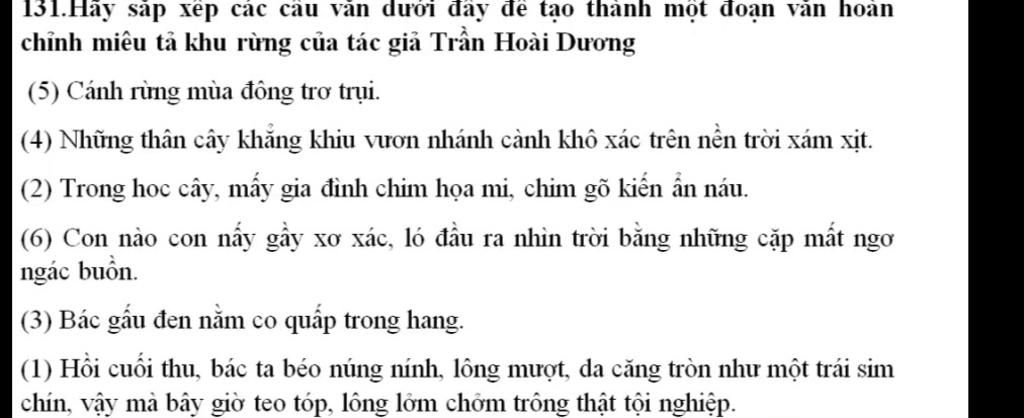 (5) Cánh rừng mùa đông trơ trụi. (4) Những thân cây khẳng khiu vươn nhánh cành khô xác trên nền trời xám xịt. (3) Bác gấu đen nằm co quắp trong hang. (1) Hồi cuối thu, bác ta béo núng nính, lông mượt, da căng tròn như một trái sim chín, vậy mà bây giờ teo tóp, lông lởm chởm trông thật tội nghiệp. (2) Trong hốc cây, mấy gia đình chim họa mi, chim gõ kiến ẩn náu. (6) Con nào con nấy gầy xơ xác, ló đầu ra nhìn trời bằng những cặp mắt ngơ ngác buồn.