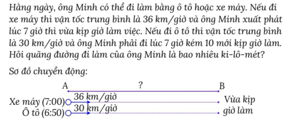 là 30 km/giờ và ông Minh phải đi lúc 7 giờ kém 10 mới kịp giờ làm.
