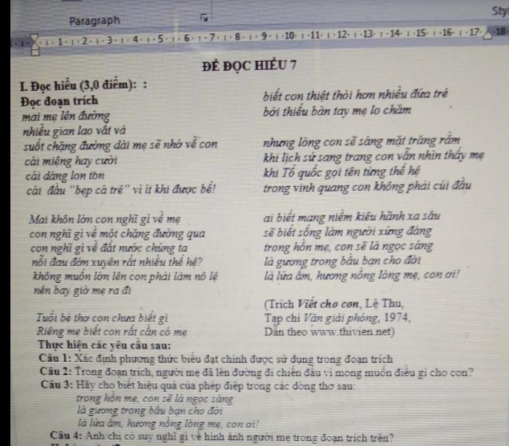 Câu 4. Anh/chị có suy nghĩ gì về hình ảnh người mẹ trong đoạn trích trên?