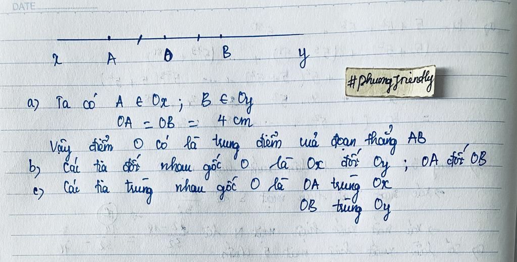`O` là trung điểm của đoạn thẳng `AB` vì `O∈AB` mà `OA=OB=4cm` nên `O` là trung điểm của đoạn thẳng `AB`.