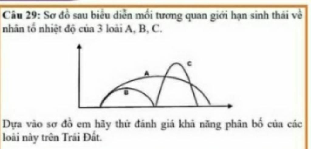 $+)$loài $C$ có giới hạn sinh thái vừa phải tuy không rộng như loài $A$ nhưng cũng không quá thấp→mức độ phân bố của loài ở mức trung bình có thể gặp ở một số nơi nhất định