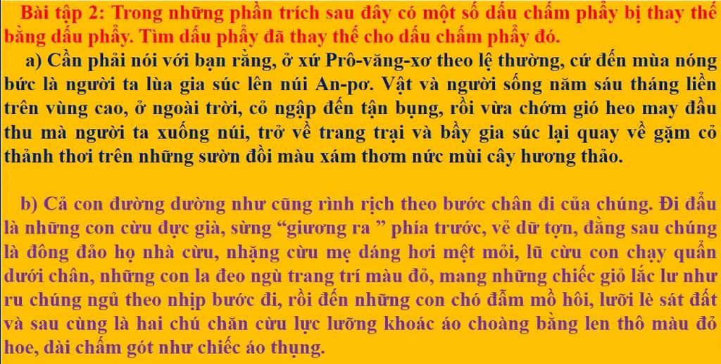 `b)` Đi đầu là những con cừu đực già, sừng ''giương ra'' phía trước vẻ dữ tợn, đằng sau chúng là đông đảo họ nhà cửa, những cừu mẹ dáng hơi mệt mỏi, lũ cừu con chạy quấn dưới chân, những con la cái đeo ngù trang trí màu đỏ, mang những chiếc giỏ đựng những chú cừu non mới đẻ, lắc lư như ru chúng ngủ theo nhịp bước đi, rồi đến những con chó đẫm mồ hôi, lưỡi lè dài sát đất và sau cùng là hai chú chăn cừu lực lưỡng khoác áo choàng bằng len thô màu đỏ hoe, dài chấm gót như chiếc áo thụng.