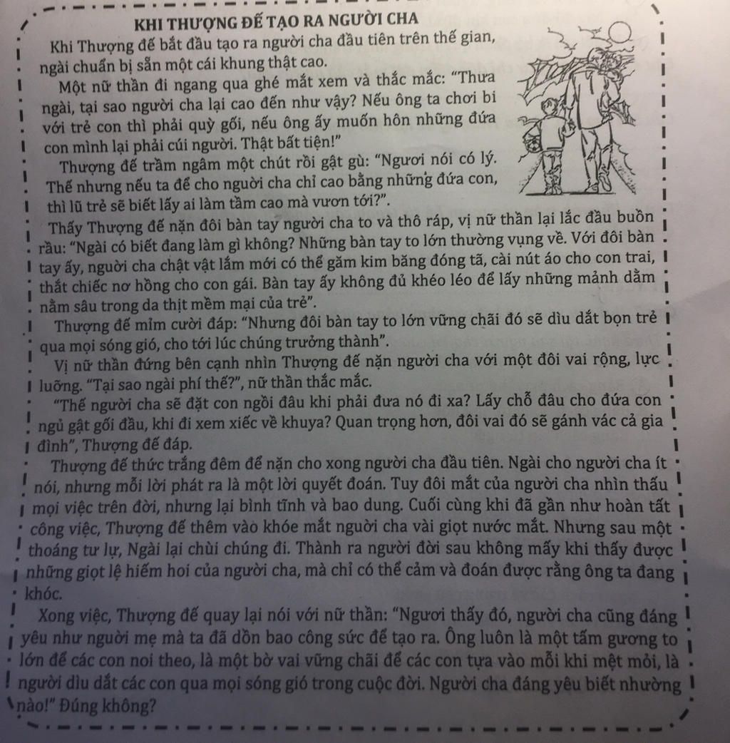 →"Theo em vì những người cha trên thế giới đều là chủ cột của gia đình họ phải đi làm kiếm tiền để nuôi gia đình họ.Và những người cha đó rất mạnh mẽ không hề yếu đuối nên họ rất ít khi khóc.Và Thượng đế chùi nước mắt cho người cha là vì không muốn người khác thấy sự yếu đuối sâu trong lòng họ".