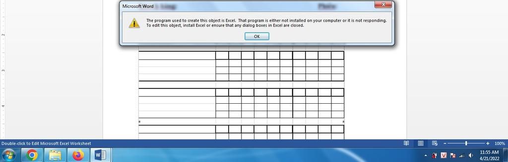 To edit this object, install Excel or ensure that any dialog boxes in Excel are closed.