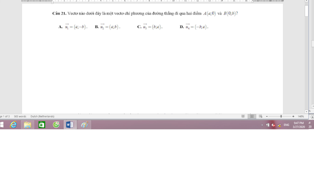 Câu 21. Vecto nào dưới đây là một vecto chỉ phương của đường thẳng đi qua hai điểm A(a;0) và B(0,6)?