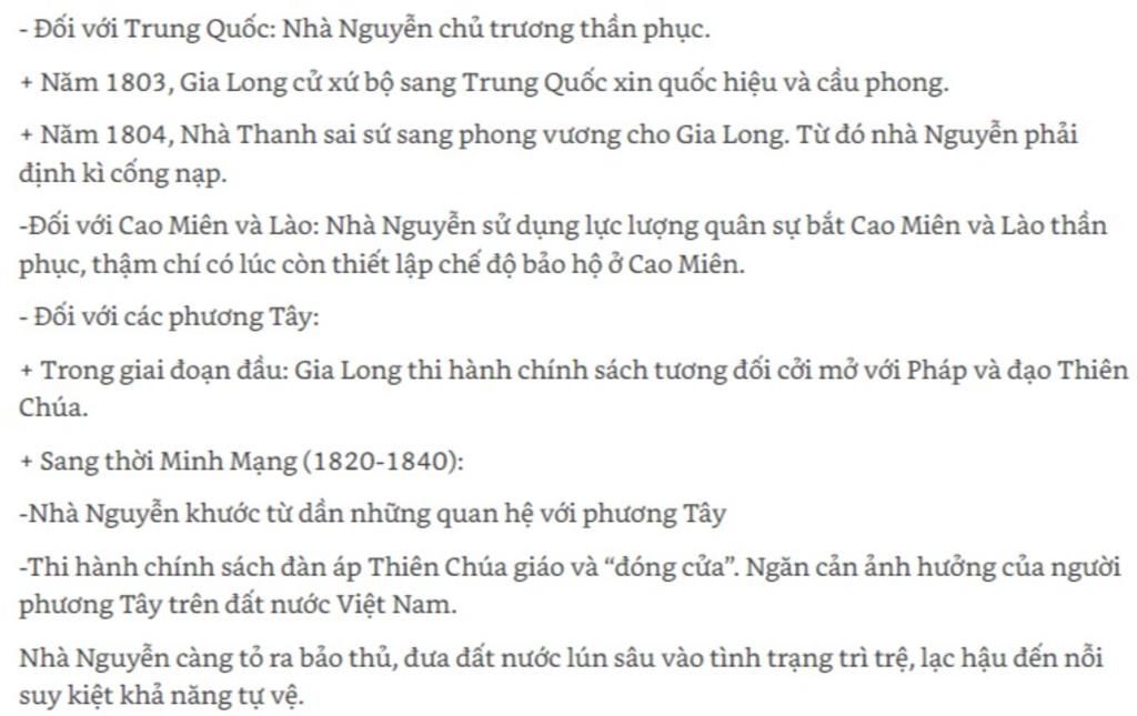 – Tích cực: Mặc dù triều đình nhà Nguyễn chịu phục tùng nhà Thanh và bắt Lào và Chân Lạp phải thần phục, quan hệ thân thiện với các nước láng giềng vẫn được duy trì.