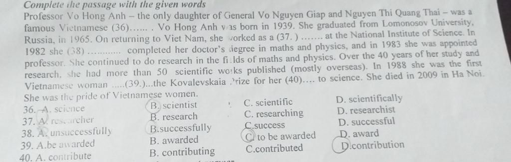 ⇒Ta cần 1 danh từ chỉ công việc, scientist: nhà khoa học