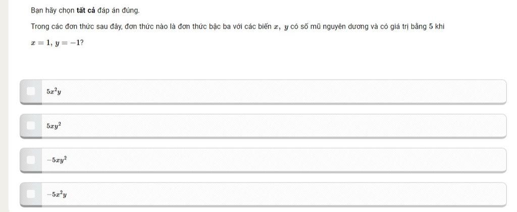 Trong các đơn thức sau đây, đơn thức nào là đơn thức bậc ba với các biến r, y có số mũ nguyên dương và có giá trị bằng 5 khi